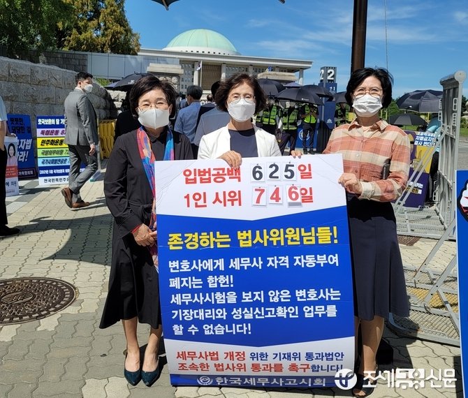 16일 이찬희 여성세무사회장이 국회 정문앞에서 세무사법 개정안 통과를 촉구하는 1인 시위에 나섰다. 이날 현장에는 여성세무사회장 출신인 김귀순 전 회장과 김겸순 전 회장(현 한국세무사회 감사)이 들려 의원들에게 세무사법 개정안의 중요성을 알렸다.