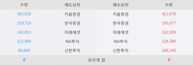 아직까지 외국계 증권사 창구를 통한 매매는 발생하지 않고 있다. 그리고 이 시간 한국증권이 매수창구상위에 올라있는 종목은 이 종목 이외에도 삼원강재, KODEX 200 등이 있다.