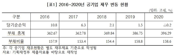 공기업군(36개)의 당기순손익은 2016년 10조8000억원에서 2020년 -1758억원으로 지속적으로 감소하는 추세를 보인 것으로 분석됐다.