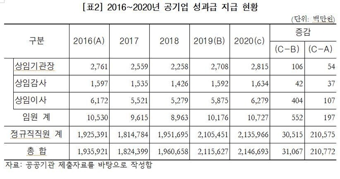 하지만 같은 기간동안 기관장 성과급은 27억6000만원에서 28억1000만원으로 증가한 것으로 나타났다. 또한 공기업 직원들의 성과급은 2016년 1조9253억원에서 2020년 2조1359억원으로 2106억원 증가했다.