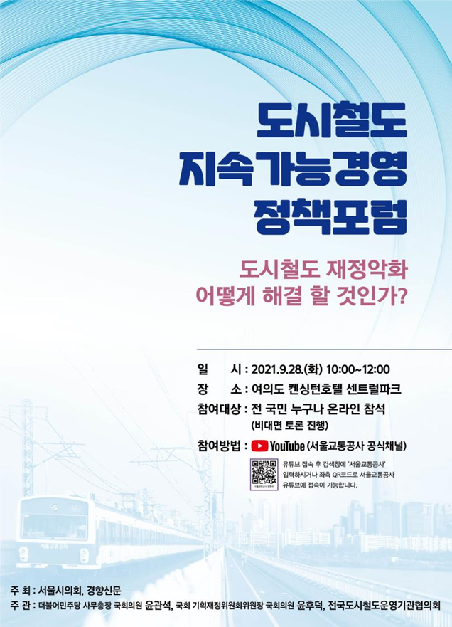 (조세금융신문=이지한 기자) 서울교통공사 등 전국 6개 도시철도 운영기관( 서울, 부산, 인천, 대구, 대전, 광주)이 국회의원(더불어민주당 윤관석·윤후덕 의원), 서울시의회, 언론사(경향신문)와 함께 28일 오전 10시 여의도 켄싱턴호텔 센트럴파크에서 '도시철도 지속가능경영 정책포럼'을 공동으로 개최했다.