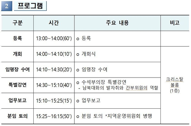 이날 이석현 민주평통 수석부의장은 의장인 문재인 대통령을 대리하여 신임 협의회장들에게 임명장을 수여하고, ‘남북대화의 발자취, 종전선언 그리고 평통 간부위원의 역할’을 주제로 특별 강연을 한다.