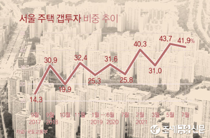 3일 국회 국토교통위원회 소속 김상훈(국민의힘) 의원이 국토교통부로부터 제출받아 분석한 서울시 주택 자금조달계획서 현황 자료에 따르면 갭투자 비율은 2017년 9월 14.3%에서 2021년 7월 41.9%로 약 4년 만에 3배 가까이 뛰었고, 올해 5월에는 43.7%까지 치솟기도 했다.