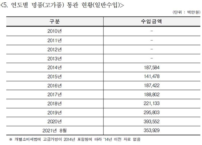 국회 기획재정위원회 소속 더불어민주당 정일영 의원(인천 연수을)이 관세청으로부터 받아 분석한 자료에 따르면, 명품가방의 수입액이 사상 처음 8월 기준 19537건으로, 3500억원을 넘긴 것으로 나타났다.