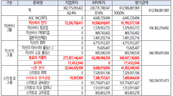 특히 국민연금이 일본 3대 전범기업에 직접투자한 비율도 높게 나타났다. 일본 대표적인 3대 재벌 전범기업에 투자된 현황을 살펴보면, 올 2월 기준 미쓰비시 그룹에 1063억원이 투자됐으며, 미쓰이는 3462억원, 스미토모는 1603억원이 투자돼 총 6129억원이 투자됐다. 이중 국미연금의 직접투자는 3822억원(62.4%)으로 위탁투자 2307억원에 비해 직접투자 비율이 높았다.