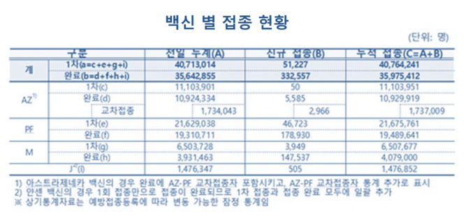 1차 접종자는 누적 4천76만4천241명으로 인구의 79.4% 수준이며, 18세 이상 인구를 기준으로 하면 91.8%다.