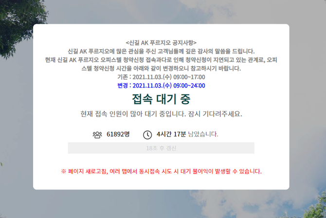 이날 청약 접수에 나선 신길 AK 푸르지오 청약신청 홈페이지는 낮 12시쯤부터 서버가 마비돼 오후 4시까지도 복구되지 않았다. 오후 5시 30분 접속 대기자는 6만1892명이며, 대기시간은 4시간 17분이다.