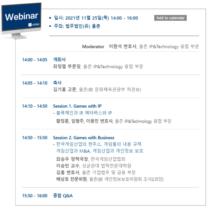 (조세금융신문=고승주 기자) 법무법인 율촌이 오는 25일 게임 산업 웨비나를 개최한다.