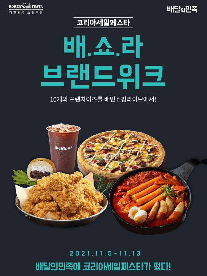 ▲7번가피자(11.5) ▲이백장돈가스(11.6) ▲아딸(11.7) ▲생활치킨(11.12) ▲피자에땅(11.13) 등 10개 외식 브랜드들은 배달앱 참여사 배달의민족과 함께 라이브커머스 방송 ‘배민 쇼핑 라이브’(배.쇼.라)를 진행, 상품권 등을 할인 판매한다.