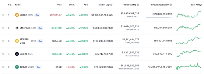 비트코인은 6만7665.16달러, 이더리움은 4819.78달러까지 오르며 신고가를 다시 세웠다.