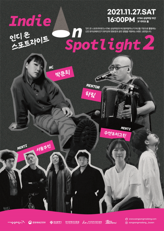 '인디온스포트라이트'는 부산을 기반으로 활동하는 신진 인디뮤지션들에게 유명 뮤지션의 멘토링을 제공함으로써 다음 단계로의 성장을 도모하기 위해 기획된 프로그램이다.
