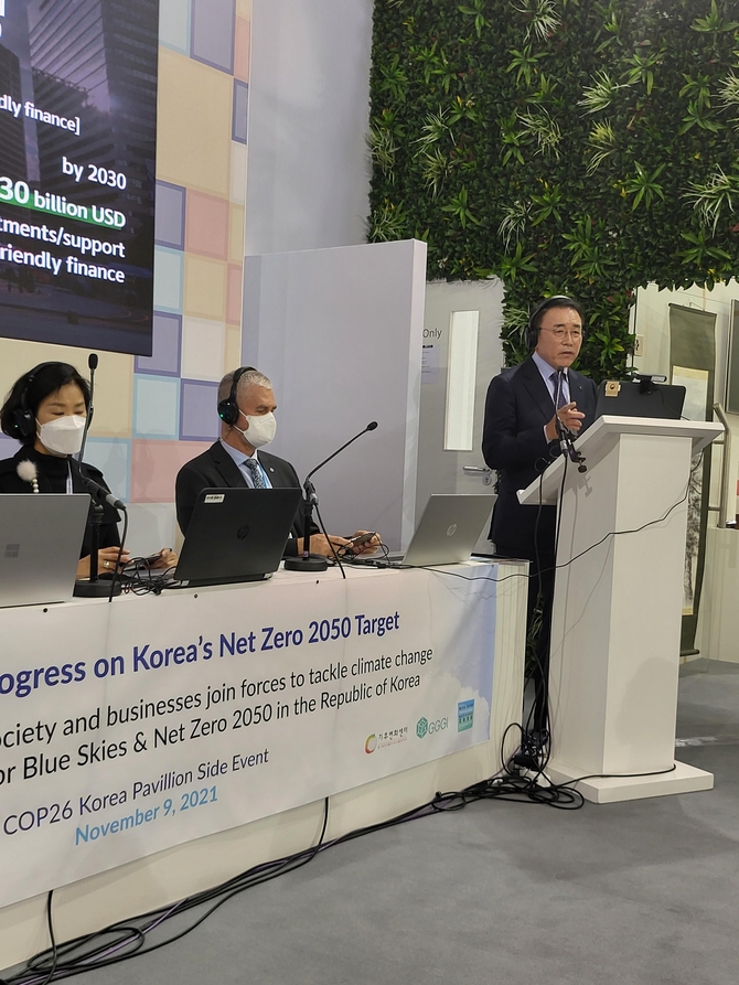 이날은 ‘글로벌 기후위기 대응을 위한 푸른하늘과 2050 넷제로 캠페인’을 주제로 우리나라의 온실가스 감축 노력을 홍보하는 행사가 개최됐는데, 한국 홍보관에서는 전 UN사무총장인 글로벌녹색성장기구(GGGI) 반기문 의장, 전 환경부 장관인 기후변화센터 유영숙 이사장의 환영사를 시작으로 김효은 외교부 기후변화 대사, 이재준 고양시장, 김소희 기후변화센터 사무총장이 정부, 지자체, 시민사회가 추진 중인 탄소중립전략에 대해 발표했다.