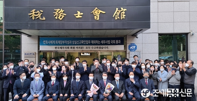 (조세금융신문=이지한 기자) 세무사법 개정안 국회 본회의 통과를 자축하는 축하 행사가 서초동 한국세무사회관 현관에서 11일 오후 열렸다.
