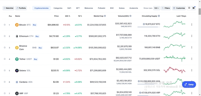 비트코인은 12일 오전 9시58분 현재(한국시간 기준) 글로벌 코인시황 중계사이트인 코인마켓캡에서 24시간 전보다 0.10% 떨어진 6만4908달러를 기록하고 있다.