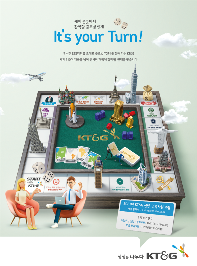 KT&G 관계자는 “KT&G를 함께 이끌어 갈 도전적이고, 열정적인 인재들이 많이 지원하기를 기대한다”며 “앞으로도 지속적인 고용 창출을 통해 국가 경제에 기여하고자 노력할 것”이라고 밝혔다.