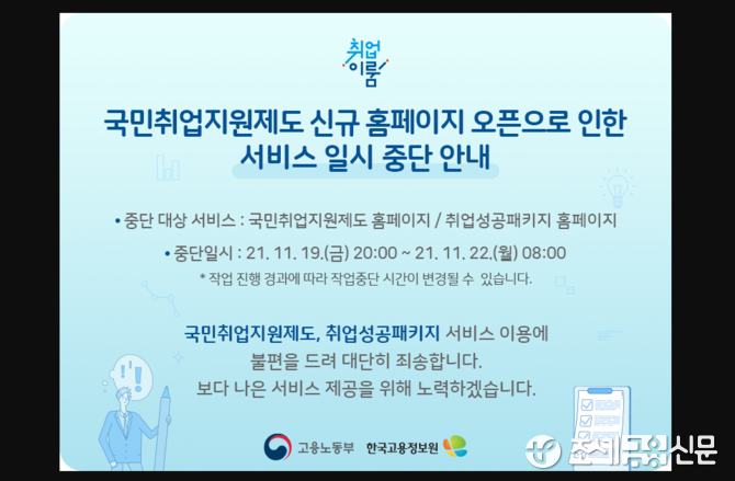 고용노동부와 한국고용정보원은 21일 구직자들이 더 편리하게 국민취업지원제도를 이용할 수 있도록 이 제도 홈페이지(www.kua.go.kr)를 개편해 22일부터 새로운 전산망으로 서비스를 제공한다고 밝혔다.