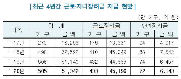 근로·자녀장려금의 평균지급액은 2017년 귀속분의 경우 79만원에 불과했으나, 2020년귀속분은 114만원으로 35만원(44%) 증가했다.