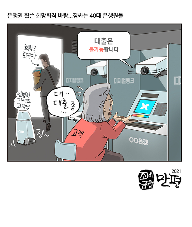 [조세금융만평] 디지털화되는 시중은행…희망퇴직 바람에 짐싸는 은행원들