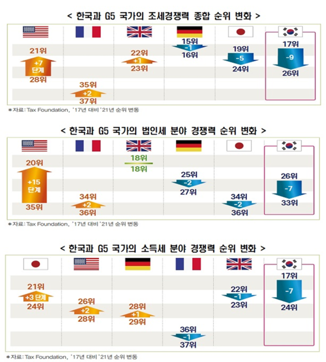 전국경제인연합회 산하 한국경제연구원은 미국 조세재단의 글로벌조세경쟁력보고서를 활용해 한국과 주요 선진국(G5)의 조세경쟁력 추이를 비교·분석한 결과를 25일 발표했다.