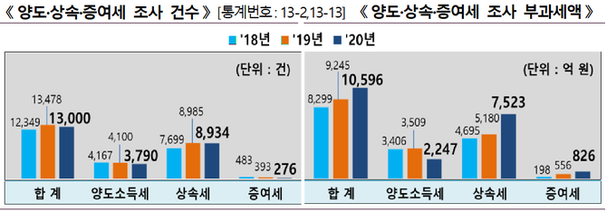 그러나 상속세 세무조사는 건수는 2019년 8958건에서 2020년 8934건으로 거의 제자리였던 반면 추징세액은 2019년 5180억원에서 2020년 7523억원으로 45.2%나 늘었다.