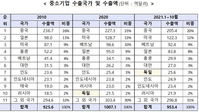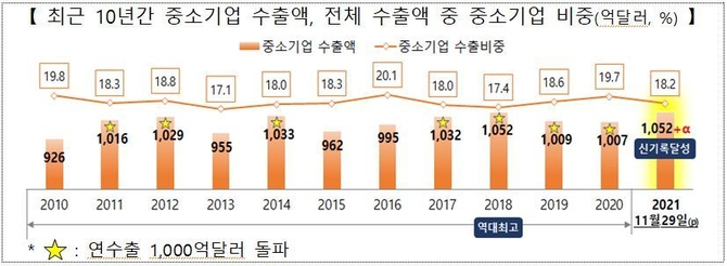 중소기업 수출액도 올랐다. 2010년 10워에는 752억달러였지만, 2021년 10월에는 953억달러로 26.7% 증가했다.