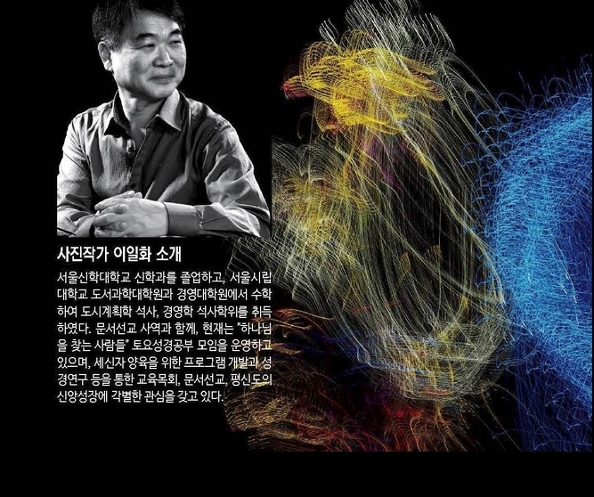 사진작가 이일화는 서울신학대학교 신학과를 졸업하고, 서울시립대 도서과학대학원과 경영대학원에서 수학하여 도시계획학 석사, 경영학 석사학위를 취득했다. 문서선교 사역과 함께, 현재는 "하나님을 찾는 사람들" 토요성경공부 모임을 운영하고 있으며, 세신자 양육을 위한 프로그램 개발과 성경연구 등을 통학 교육목회, 문서선교, 평신도의 신앙성장에 각별한 관심을 갖고 있다.