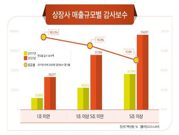 감사보수 증가율을 매출 규모별로 보면 5조원 이상인 기업은 감사보수가 2.1배 증가했지만, 1조원 미만인 기업은 2.8배 증가했다. 매출이 작을수록 감사보수 증가율이 높아지고, 감사보수 지출에 대한 부담 역시 커진 것으로 분석된다.