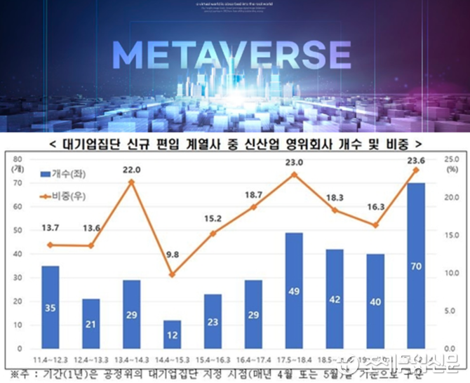 (조세금융신문=홍채린 기자) 최근 1년간 헬스케어와 가상·증강현실 등 신산업 분야 대기업 계열사가 빠르게 늘면서 신규 계열사 중 신산업 관련 회사의 비중이 10년 내 최고를 기록했다.