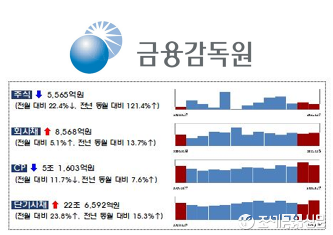 지난달 기업어음(CP)과 단기사채 발행액은 156조49천78억원으로 12.6% 늘었고, CP 발행 규모는 38조9천600억원으로 11.7% 줄었으나 단기사채 발행액이 117조9천479억원으로 23.8% 증가했다.