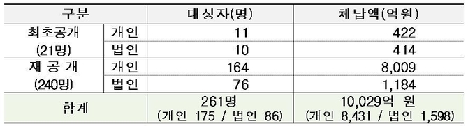 이번에 공개된 고액·상습 체납자의 전체 체납액은 1조 29억원이다. 개인 최고액은 4483억 원이며, 법인 최고액은 292억 원이다. 1인 평균 체납액으로 따지면 38억 원에 해당한다.