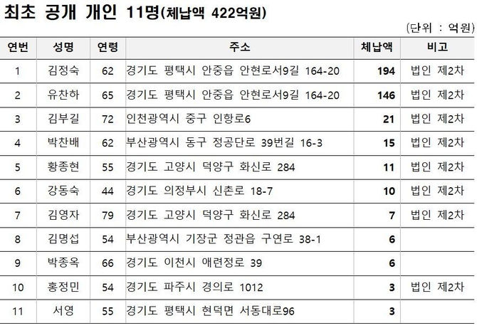 체납액은 총 836억 원으로, 개인 최고액은 194억 원, 법인 최고액은 292억 원이다. 개인 최고액 체납자는 법인 최고액 체납자의 2차 납세의무자로서 개인과 법인이 동시에 신규 공개명단에 포함되었다.