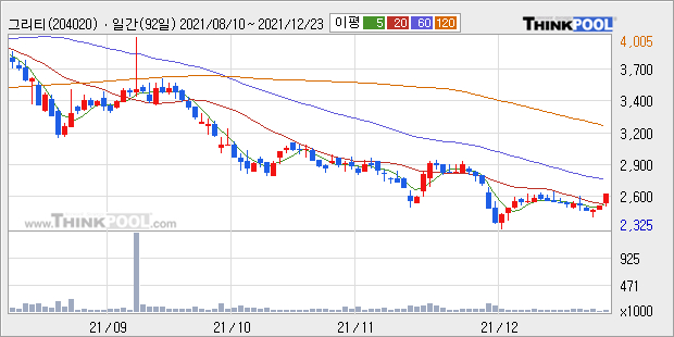 그리티의 2020년 매출액은 전년대비 0.3% 늘어난 1235억원이고, 영업이익은 전년대비 -26.1% 줄어든 22억원을 기록했다. 이 회사의 매출액 증감률과 영업이익 증감률은 각각 코스닥 상위 50%, 하위 39%에 해당된다.