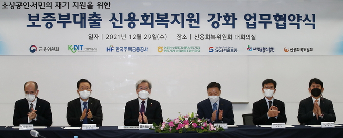29일 금융위원회는 신용보증재단, 주택금융공사, 서민금융진흥원. 농림수산업자신용보증기금, SGI서울보증보험 등 5개 보증기관과 이 같은 내용의 ‘보증부대출 신용회복 지원 강화를 위한 업무협약’을 체결했다고 밝혔다.