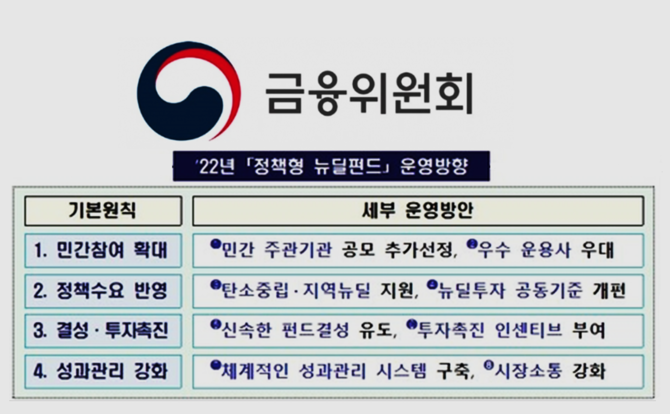 또 정책적 수요와 시장의 의견을 반영해 펀드를 조성해나갈 계획이다. 예컨대 탄소중립·지역뉴딜 등 정책적 지원이 필요한 분야에 대한 펀드 자금공급을 강화하고, 메타버스 등 최신 뉴딜 동향을 반영해 미래 핵심 산업 지원에 힘쓴다.