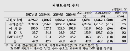 한국은행이 5일 발표한 외환보유액 통계에 따르면 작년 12월말 기준 우리나라 외환보유액은 4천631억2천만달러로 집계됐다. 11월말(4천639억1천만달러)보다 7억9천만달러 줄었다.