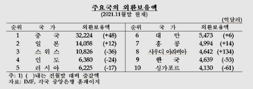 한국의 외환보유액 규모는 11월말 기준으로 세계 9위 수준이다. 중국(3조2천224억달러)이 가장 많고, 일본(1조4천58억달러)과 스위스(1조826억달러)가 뒤를 이었다.
