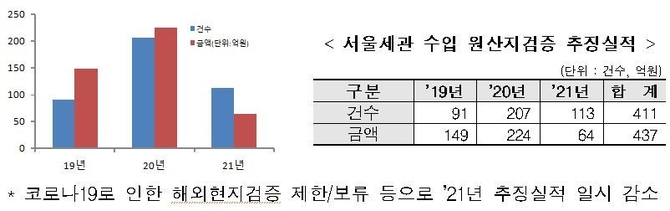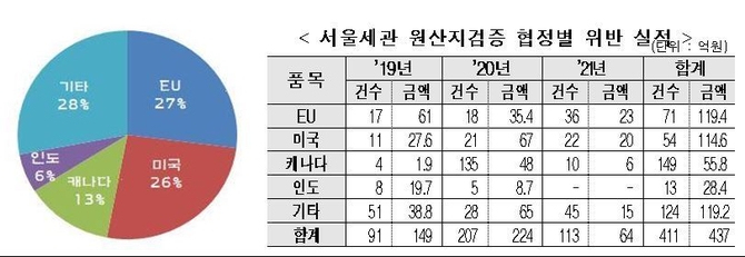FTA 수입검증에 대해선 지난 3년간 서울세관이 수행한 원산지 검증 결과, 수입물품의 원산지기준 불충족 사례는 총 411건이었다. FTA 부당특혜 추징액은 총 437억원에 달한다.