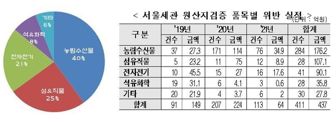 품목별 위반내역은 농림수산물(40%), 섬유직물(25%), 전기전자(21%) 순으로 나타났다.