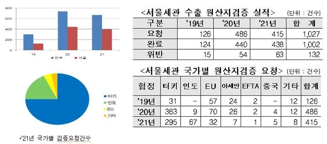 한편, 수출물품에 대한 해외 관세당국의 FTA 원산지 검증 요청은 매년 증가하는 가운데, 서울세관은 지난 3년간 1002건을 완료하고 132건의 위반내용을 적발했다. 검증완료건 대비 위반율은 약 13% 수준으로 나타났다.