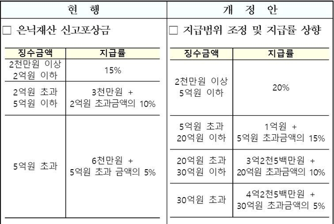 6일 기획재정부가 발표한 세법시행령에 따르면 은닉재산 신고포상금이 현행 15%에서 20%로 인상됐다.