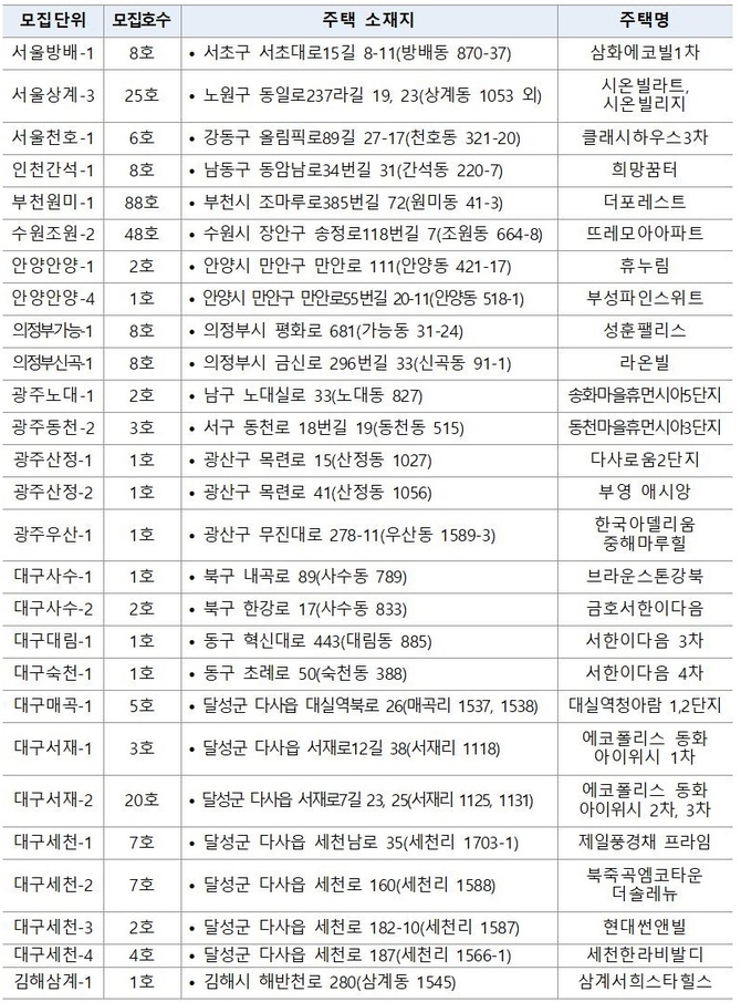 이번에 접수를 실시하는 주택은 총 264호다. 이 가운데 수도권은 서울 서초·노원·강동에서 39호, 인천 남동구에서 8호, 경기 수원·안양·부천·의정부시에서 155호가 공급되며 지방권에서는 대구 북구·동구·달성군에서 53호, 광주 남구·서구·광산구에서 8호, 경남 김해시에서 1호가 공급된다.