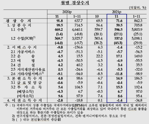 한국은행이 11일 발표한 국제수지 잠정통계에 따르면 11월 경상수지는 71억6천만달러(약 8조5천777억원) 흑자로 집계됐다.