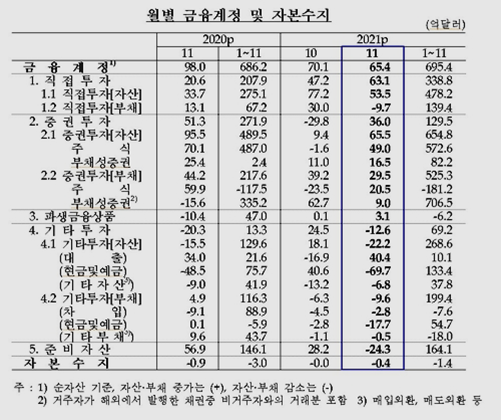 금융계정 순자산(자산-부채)은 11월 중 65억4천만달러 늘었다. 직접투자의 경우 내국인의 해외투자가 53억5천만달러 증가했지만, 외국인의 국내투자는 9억7천만달러 줄었다. 증권투자에서는 내국인 해외투자가 65억5천만달러, 외국인의 국내 증권투자 역시 29억5천만달러 늘었다.
