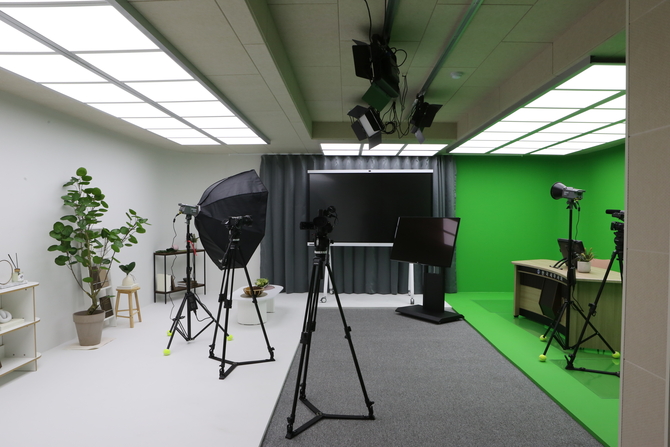 또, 다양한 형태의 영상을 촬영할 수 있도록 편집 시 화면 합성이 자유로운 녹색 바탕의 크로마키 공간과 딱딱하지 않고 조금 더 자연스러운 장면을 연출할 수 있도록 가구 등이 배치된 하얀 바탕의 공간(화이트호리존) 등도 마련돼 있다.