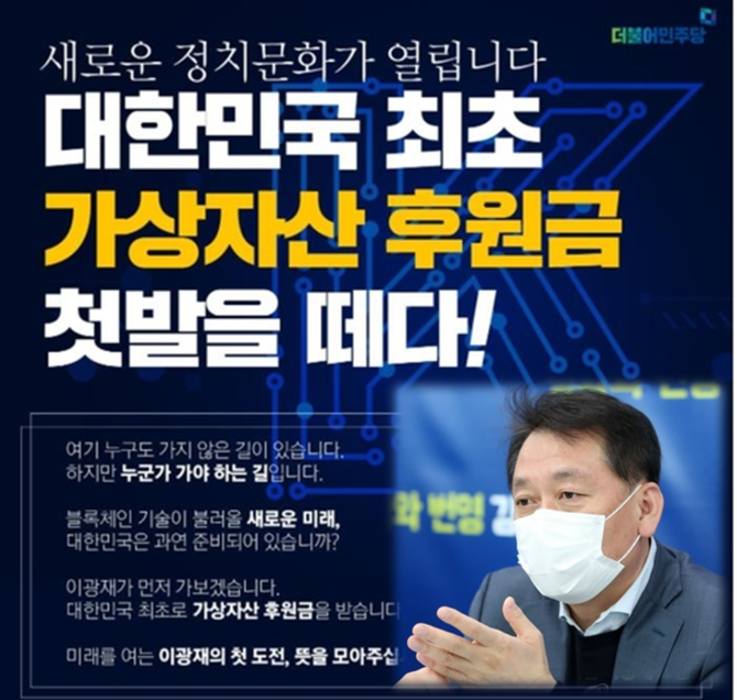 (조세금융신문=최주현 기자) 더불어민주당 이광재 의원이 국내 최초로 가상자산(가상화폐) 후원금 모집 사이트 '광재의실험실.com'을 개설했다.
