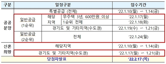 공공분양 일반공급은 입주자모집 공고일(2021년 12월 29일) 기준, 수도권에 거주하는 무주택세대구성원으로, 입주자저축 가입자 중 순위별 자격을 갖춘 경우 신청이 가능하다.