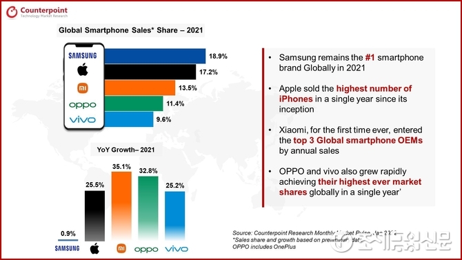 연간 판매량 기준으로 샤오미는 이번이 가장 높은 순위였고, 오포와 비보 역시 최고 점유율을 달성했다. 그러나 전년 대비 성장률로는 삼성전자가 0.9%로, 이들 5개 업체 중 가장 낮았다.