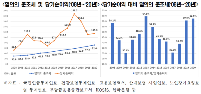 이중 기업이 주로 부담하는 협의의 준조세는 약 72조원으로, 이는 2020년 법인세의 1.3배, 기업 당기순이익의 62.5%에 달하는 수준이다.