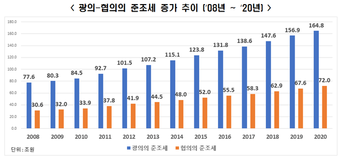 기업 활동 규모가 커짐에 따라 준조세도 증가할 수밖에 없는데 한국은행 기업활동조사에 따르면 금융보험업을 제외한 2008년 전 산업 기업 매출은 1604조원에서 2020년 2360조원으로 756조원 증가했다. 이 기간 준조세는 41.4조원 증가했다.