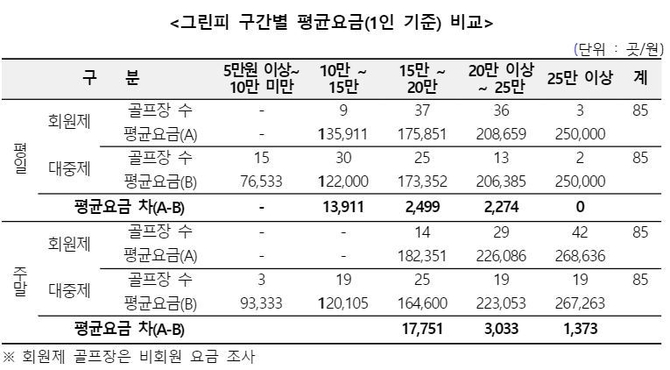 회원제와 대중제 간 그린피 구간별 평균요금 차이를 보면, 회원제가 평일 기준 '10만원 이상~15만운 미만'에서 13911원, '15만원 이상~25만원 미만'에서 2,000여원이 비쌌고, 25만원 이상에서는 동일했다.